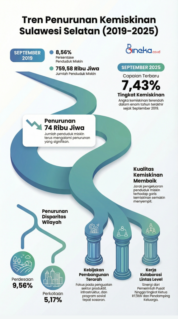 Makassar, Bineka.co.id – Badan Pusat Statistik (BPS) Sulawesi Selatan mencatat tren tingkat kemiskinan di Sulsel terus menunjukkan penurunan signifikan dalam kurun waktu enam tahun terakhir, sejak tahun 2019 hingga September 2025.