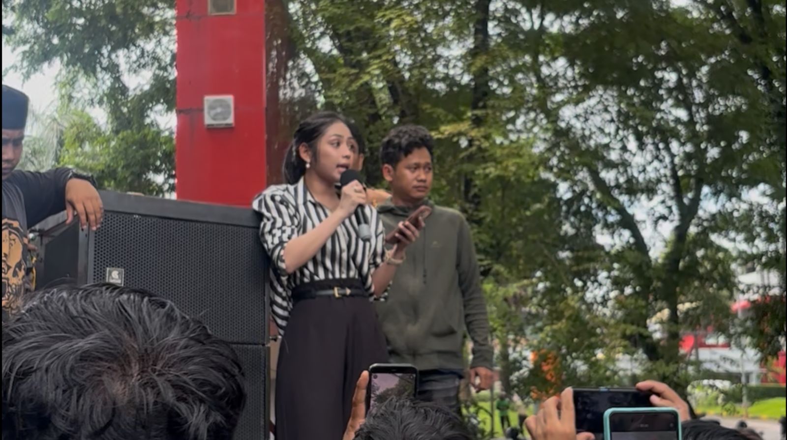 “Saya berdiri di sini bukan karena tidak memiliki kesalahan, namun karena hak hak kemanusian saya telah dicabut. Karena atas aksi confidential yang tersebar luas di publik, bahkan diperjualbelikan seharga kopi yang saya minum sehari-hari,” ujar Nira di hadapan massa aksi.