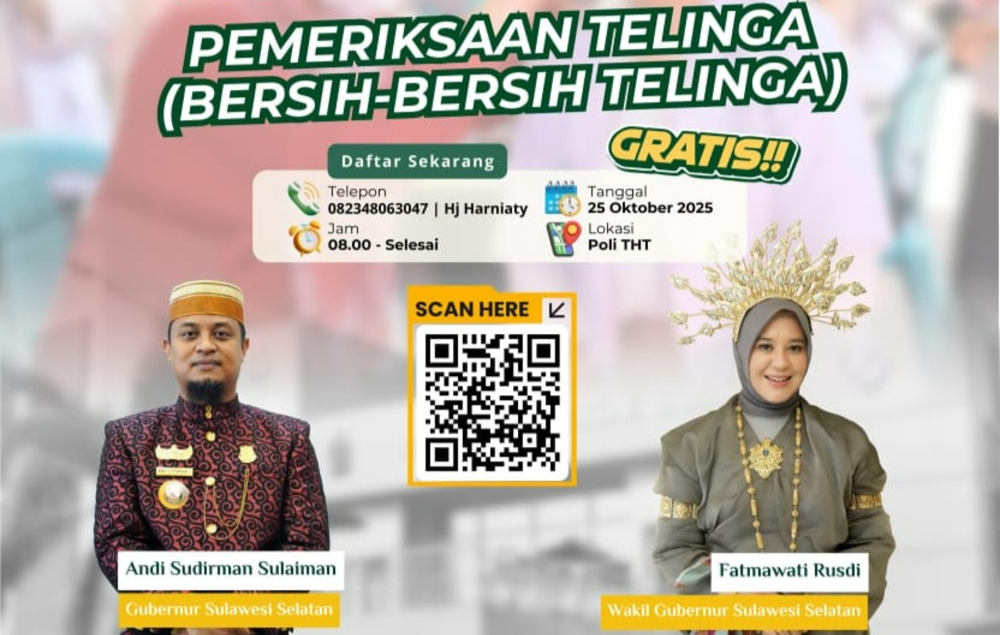 Kegiatan ini berupa pemeriksaan dan pembersihan telinga (Bersih-Bersih Telinga) yang dilaksanakan di Poli THT RSUD Haji Makassar yang akan dilaksanakan pada 25 Oktober 2025, mulai pukul 08.00 WITA hingga selesai.