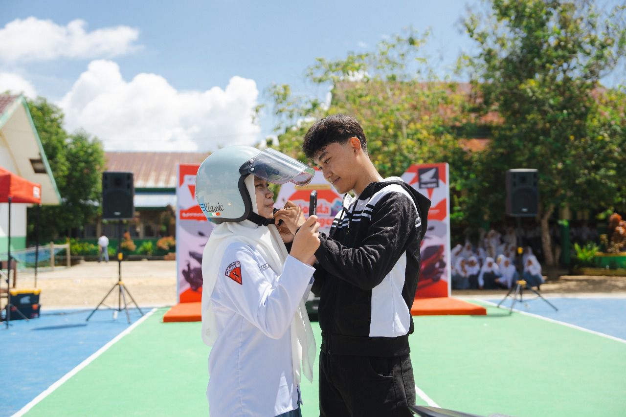 Tak hanya memanjakan mata, para siswa juga diberi kesempatan langsung menjajal sejumlah unit melalui sesi riding experience. Sebelum mencoba motor, mereka lebih dulu dibekali edukasi safety riding, termasuk pentingnya mengenakan perlengkapan berkendara seperti helm dan sarung tangan.